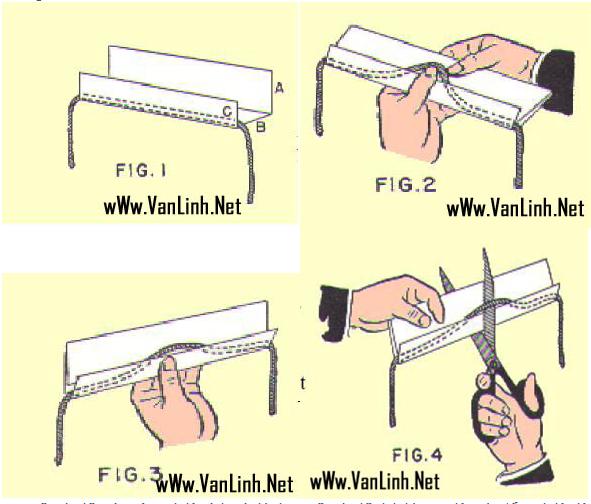 Bạn gấp tờ giấy và xuôn sợi dây (Pic 1); lúc bạn gấp tờ giấy lại thì ngay lập tức đẩy sợi dây lên (Pic 2); sợi dây được đẩy ra khỏi miếng gấp (Pic 3); bạn đưa kéo vào cắt ngang miếng giấy thì một bên của cái kéo được luồn ra khỏi sợi dây, và tất nhiên khi cắt thì chỉ miếng giấy bị cắt còn sợi dây thì không.